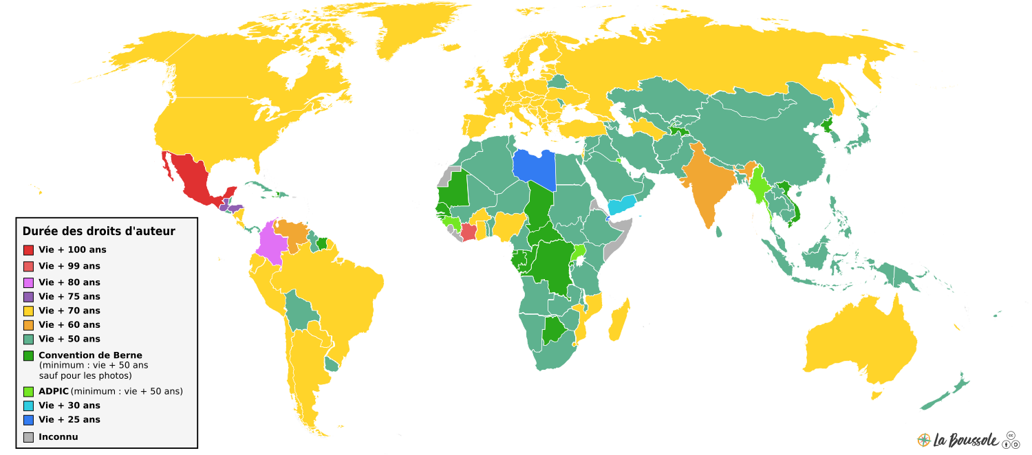 À l'échelle mondiale, la plupart des pays ont adopté une protection durant la vie de l'auteur·e + 50 ou + 70 ans après son décès.